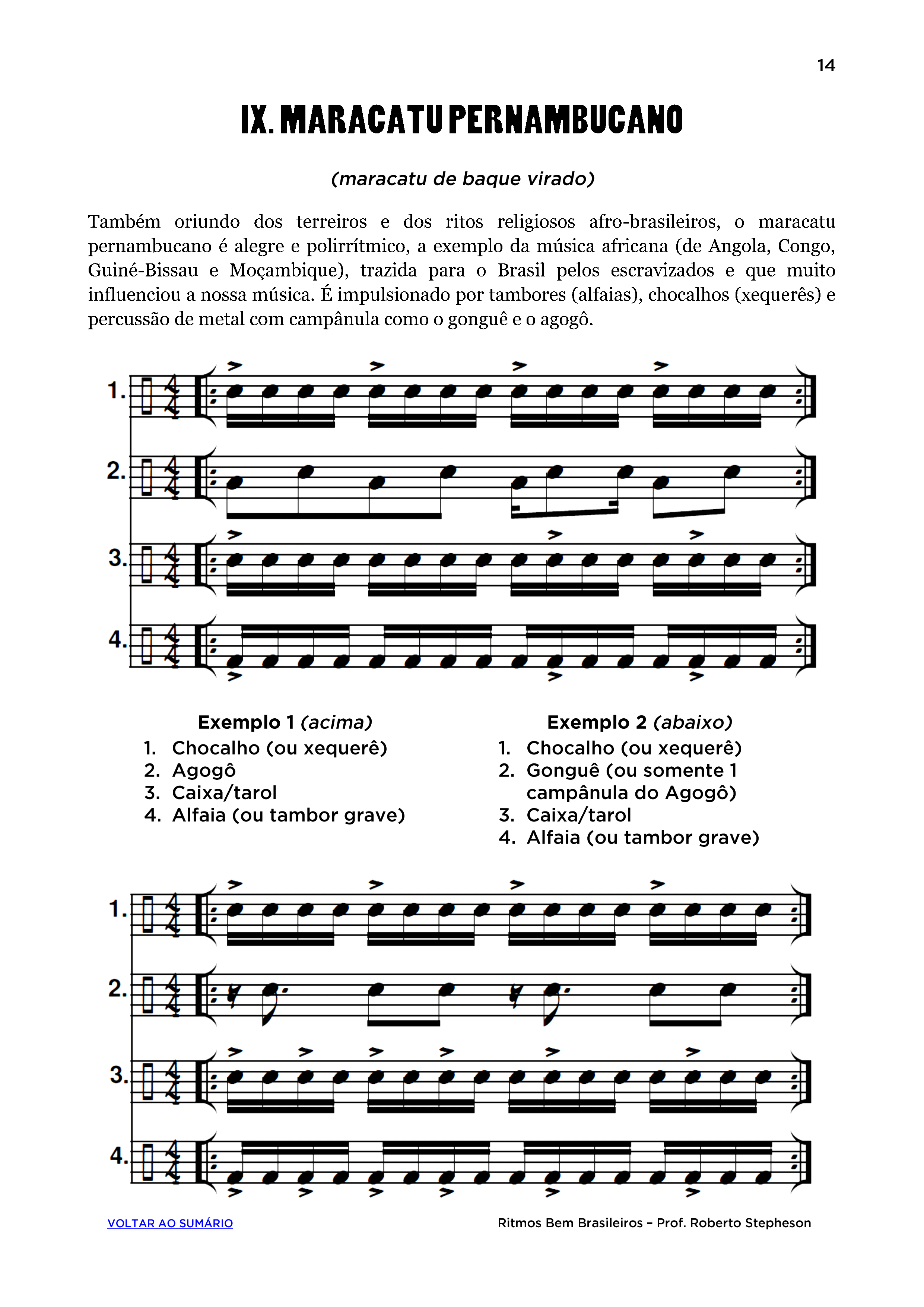 Com o objetivo de contribuir na aprendizagem da percussão e no entendimento preliminar de alguns ritmos brasileiros, destaco e apresento a grafia musical do baião, caboclinho, capoeira, ciranda, frevo/marcha de carnaval, ijexá, jongo, maracatu cearense, maracatu pernambucano, quadrilha junina, samba, samba reggae e do xote. As batidas (células/patterns) e exemplos aqui destacados, frutos de minhas viagens pelo Brasil, curiosidade e experiência musical ao longo dos anos, apresentam variações e instrumentação rítmica básica, que podem mudar de acordo com as regiões e grupos executantes locais.